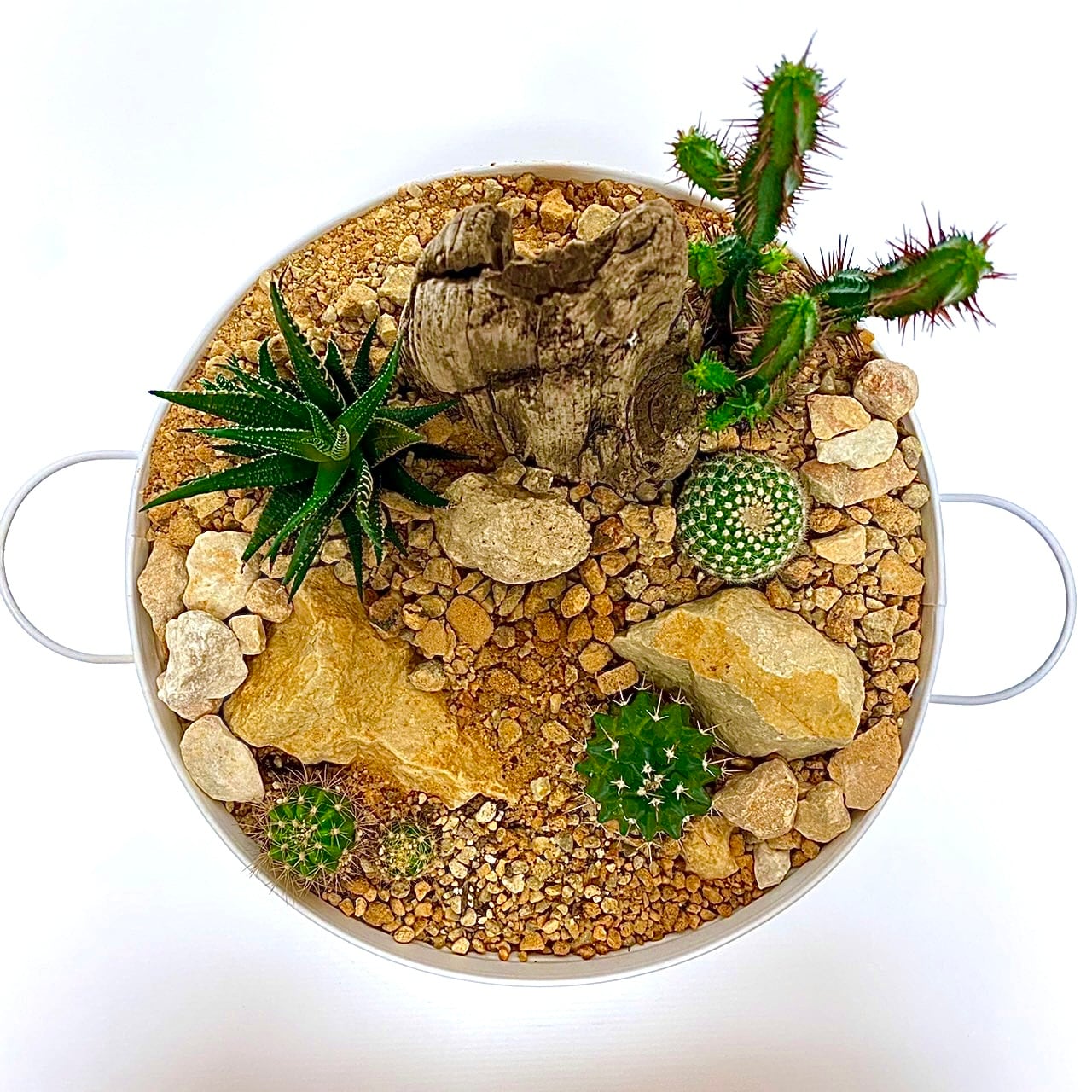 サボテンや流木で高低差を表現して立体的なドライガーデンに仕上がっております。